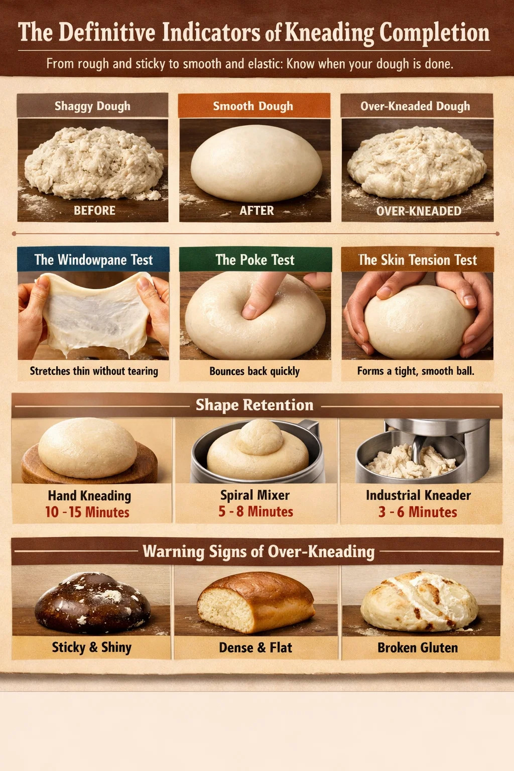 Ahelyett, hogy pusztán egy időzítőre hagyatkozna, amely pontatlan lehet a páratartalom vagy a lisztfehérje-tartalom miatt, használja ezeket a fizikai referenciaértékeket az Ön állapotának ellenőrzésére. összegyúrt anyag.