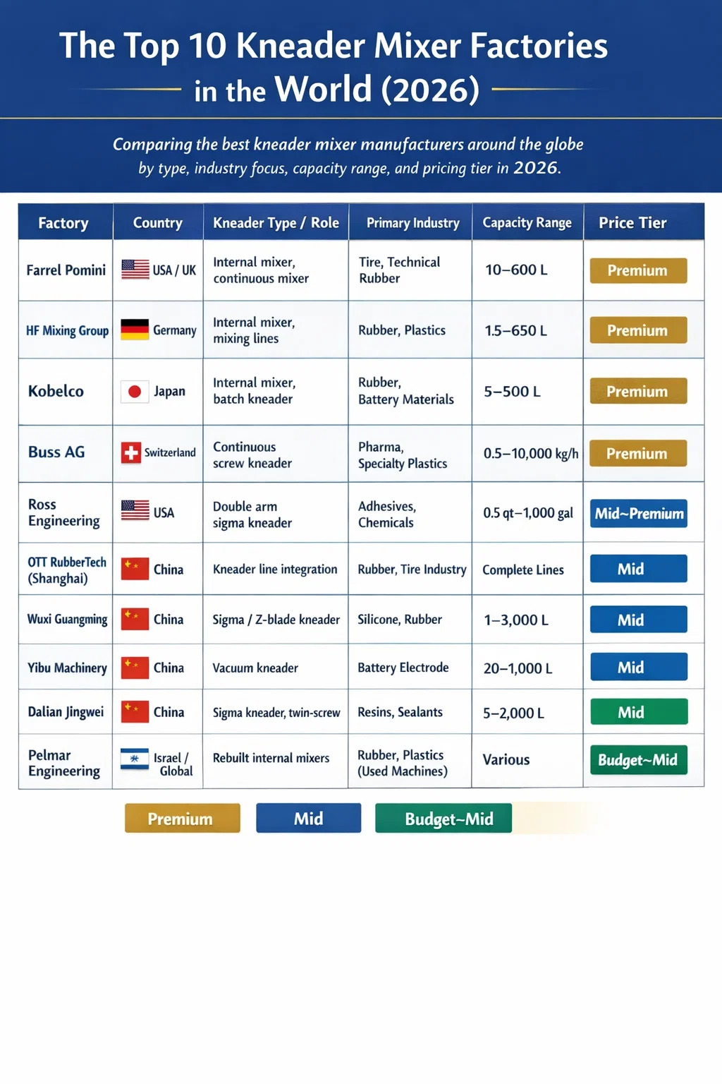 | Gyári | Ország | Gyúró típusa / szerepe | Elsődleges ipar | Kapacitás tartomány | Árszint |