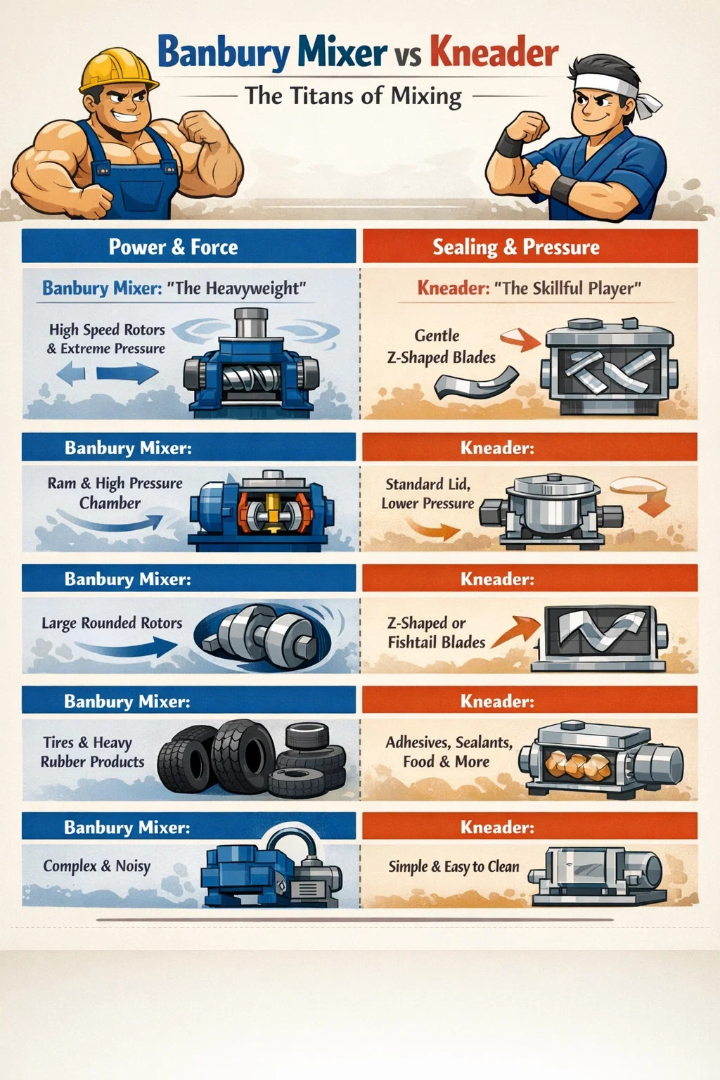 A gumi- és műanyagfeldolgozás világában a **Banbury keverők és dagasztók** olyanok, mint két különböző személyiségű erős ember. Bár mindkettő képes egyenletesen keverni a viszkózus alapanyagokat, munkamódszerükben és teljesítményükben jelentősen eltérnek egymástól.